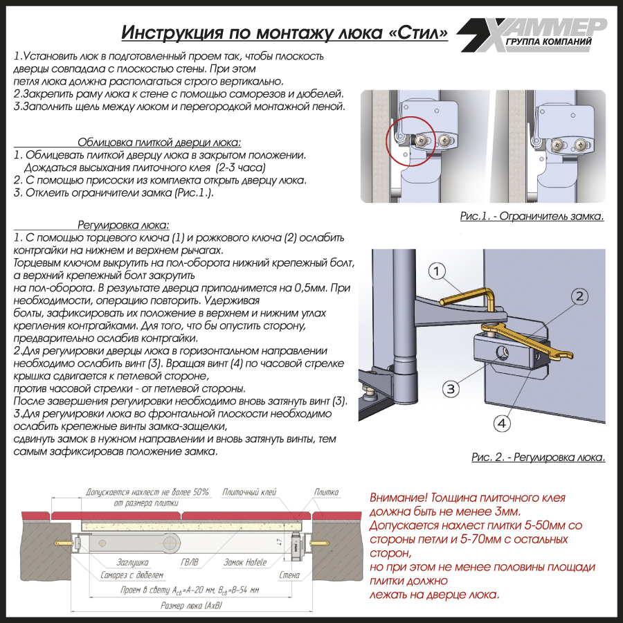Люк под плитку Хаммер Стил 40x40, 3D-регулировка. Монтаж люка прост и не требует подрезки плитки в зоне люка, т.к. имеется возможность оклеивания дверцы отделочным материалом внахлест. Заполнение дверцы: ГВЛВ (гипсоволоконный лист влагостойкий). Жесткость стальной конструкции колоссально увеличивает ресурс изделия. Изображение и цвет на мониторе могут отличаться от оригинала. |