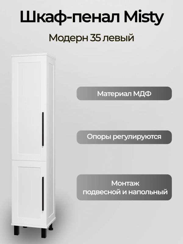 Шкаф-пенал Misty Модерн 35 с Б/К, левый, белый П-Мод05035-011Л из влагостойкого МДФ (Польша, Австрия).Свойства. Фасад из МДФ. Корпус из ЛДСП. Покрытие-эмаль. Цвет-RAL9010 белый. Петли с доводчиком. Шкаф-пенал Модерн 35 см П-Мод05035-011Л напольный с распашными дверцами, ящиками и бельевой корзиной. Универсальный монтаж, можно установить как напольный, так и подвесной. Производство. Компания Мисти более 17 лет выпускает качественную мебель для ванной комнаты. Заводской комплекс под Москвой, оснащенный передовым оборудованием из Европы и работающий по новейшим технологиям. Качество. Строгое соблюдение всех международных и европейских стандартов. Многоэтапный контроль качества от выбора сырья до проверки готового продукта. Изображение и цвет на мониторе могут отличаться от оригинала. Комплектность: