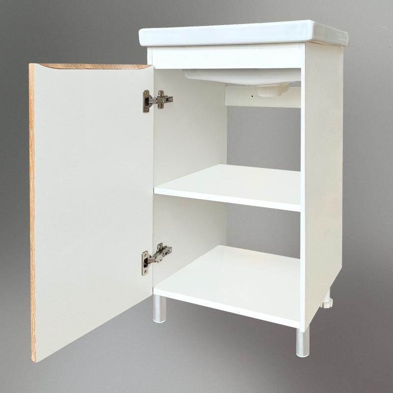 Напольная тумба под раковину Виктория 50 см EB.50.24.00.N из водостойких материалов.Свойства. Фасад из МДФ. Корпус из ЛДСП. Несъемные внутренние полки. Размеры указаны без учета габаритов умывальника. Производство. Компания Мебесон выпускает мебель Акваль для ванных комнат с 2002 года. Крупные растущие производственные мощности. Эффективные современные технологии. Продукция широко представлена по всему СНГ. Качество. Надежные шкафы и зеркала выполнены из материалов, устойчивых к постоянной повышенной влажности и воздействию химических веществ. Фурнитура из нержавеющей стали, покрытой хромом, от известных производителей. Продукция соответствует всем требованиям и нормам РБ. Дизайн. Красивая модная мебель различных стилевых направлений. Вписывается в классические и ультрасовременные интерьеры. Широкий размерный ряд. Отличное решение для небольших санузлов по выгодной цене от производителя. Изображение и цвет на мониторе могут отличаться от оригинала. Комплектность: