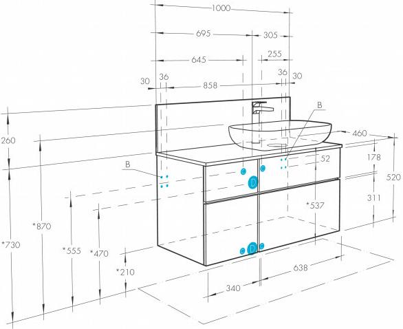 В комплекте: столешница 1A277103MIDR0, регулируемый навес-2 шт.Дополнительно комплектуется: умывальник Infinity 60 1AX169WBXX000, смеситель, сифон. |