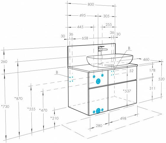В комплекте: столешница 1A277003MIDR0, регулируемый навес-2 шт.Дополнительно комплектуется: умывальник Лола 60 1A73313KLK010, смеситель, сифон. |