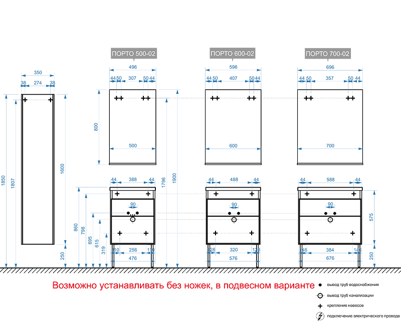 Дополнительно комплектуется: умывальник Порто 500 4810924220301, смеситель, сифон. |