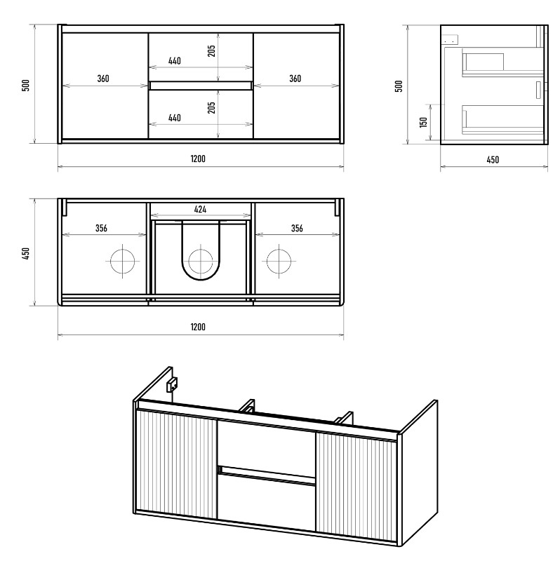 В комплекте: подвесы-2 шт.Дополнительно комплектуется: умывальник Onda 120 см, смеситель, сифон. |