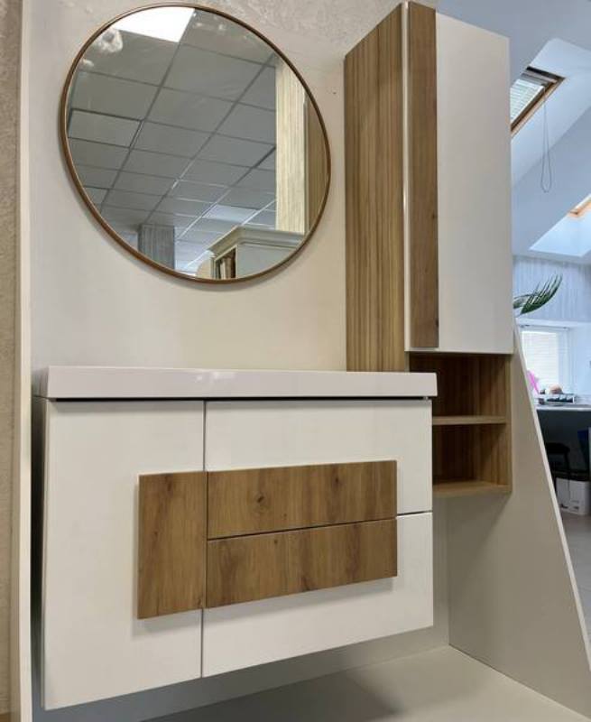 Тумба под раковину Garda Sorento 90 см, 14.60н.900 из влагостойкой МДФ.Свойства. Фасад и корпус из МДФ, цвет-белый глянцевый, покрытие-эмаль. 2 выдвижных ящика, направляющие скрытого монтажа с доводчиком. 1 распашная дверь, петли с доводчиком, внутри 1 полка-ЛДСП на полкодержателях. В верхнем ящике предусмотрен вырез под сифон. Без задней стенки. Ящики из ЛДСП, цвет-серый. Ручки на ящиках-покрытие PVC, цвет-дуб артизан. Размеры указаны без учета габаритов умывальника. Производство. Компания Garda занимает лидирующую позицию в Беларуси по выпуску фасадов из МДФ более 20 лет. В 2019 году освоила новое направление в изготовлении мебели для ванных комнат. Высокотехнологичное оборудование. Качество. Материалы мировых брендов. 5 ступеней нанесения эмали видимых частей фасадов и боковин. Фурнитура с доводчиками известных производителей для плавного хода дверей и ящиков. Контроль на каждом этапе производства. Изображение и цвет на мониторе могут отличаться от оригинала. Комплектность: