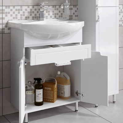 Тумба с умывальником Alavann Виттория 65-02 4680300002551. Материал фасада-ламинированная МДФ, покрытие-пленка ПВХ. Материал корпуса-ламинированная ЛДСП. Два распашных фасада на петлях с доводчиками. Выдвижной ящик на шариковых направляющих полного выдвижения. Мозаичные ручки в ряд. Изображение и цвет на мониторе могут отличаться от оригинала. Комплектность: