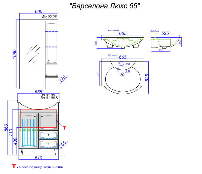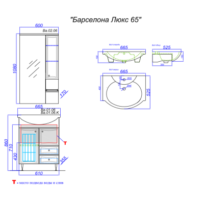Материал-МДФ. Тумба с умывальником Aqwella Barcelona-Lux 65 Т6\Ba-L.01.06\7.26565B имеет два ящика. Комплектность: