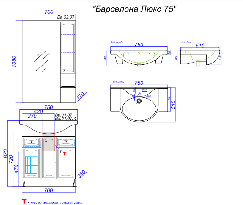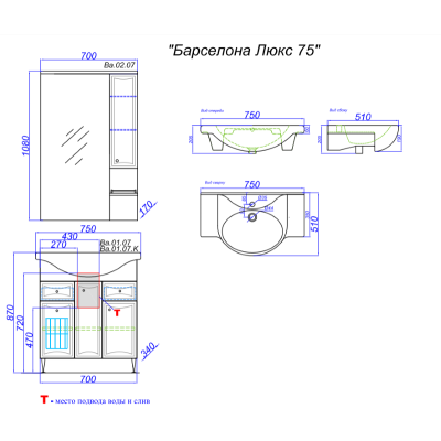 Материал-МДФ. Тумба с умывальником Aqwella Barcelona-Lux 75 Т7\Ba-L.01.07\7.07.02 имеет два ящика. Комплектность: