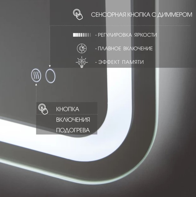 В комплекте: дюбель-крючки 2шт., встроенный LED-светильник холодный свет, сенсорный выключатель, регулировки яркости, антизапотевание, шнур с вилкой. |