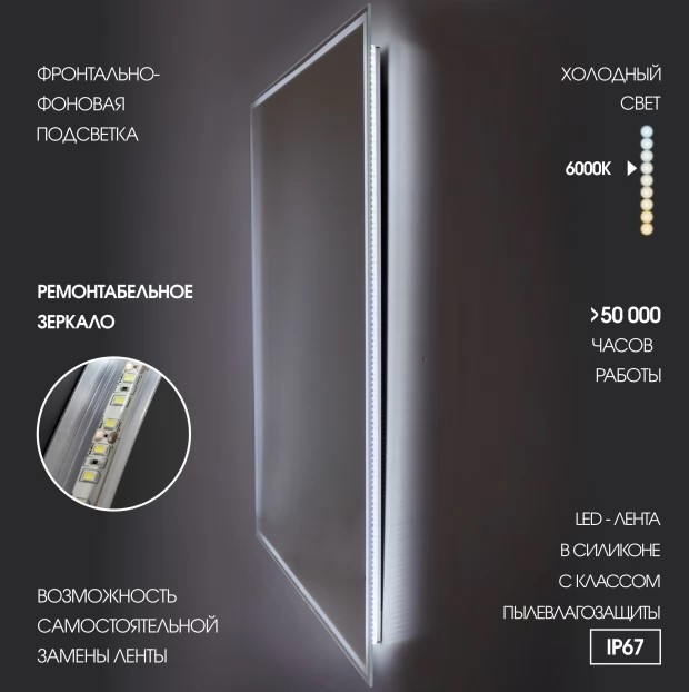 Сенсорное зеркало с холодным фронтально-фоновым освещением Алмаз-Люкс ЗП Travel Darwin 80100s-6 90x70 из серебряного зеркального полотна AGC (Япония) в непрозрачном коробе из прочного пластика.Свойства. Толщина: зеркало-2.5 мм, полотно-4 мм. Ширина светящейся полосы-2 см. Подсветка по периметру, свечение по рисунку. Углубление в конструкции корпуса позволяет разместить соединенные электрические провода. Светодиоды запитаны напряжением 12 В. Температура свечения 6000 К. Срок службы не менее 50 000 ч непрерывной работы. Подключение к электрической сети 220-240 В, 50 Гц. Низкое энергопотребление А++. Надежные металлические крепления на стену. Все необходимое для монтажа входит в заводскую комплектацию. Бесконтактное зеркало со встроенным светильником Алмаз-Люкс ЗП Travel Darwin 80100s-6 90x70 см подходит для установки в любую комнату или санузел. Производство. Компания Алмаз-Люкс более 20 лет выпускает качественные зеркала, зеркальную плитку, обеденные и журнальные столы и полки из стекла. Фабрика в Бобруйске оснащена современным итальянским оборудованием. Автоматическая обработка зеркал на европейском оборудовании: шлифовка, полировка, фацет, гравировка, пескоструйка, фотопечать, высверливание отверстий, мойка и проверка качества. Ручное приклеивание пластин, прикручивание металлической фурнитуры, фиксация стеклянных полок. Качество. Вся продукция проходит испытания и отвечает белорусским, европейским и международному стандарту ISO 9001. Дизайн. Проектированием моделей занимается европейская команда дизайнеров. Индивидуальный подход. Возможна разработка нестандартных вариантов по макетам клиента под заказ. Стоимость и сроки изготовления можно узнать у наших менеджеров. Изображение на мониторе может отличаться от оригинала. Комплектность: