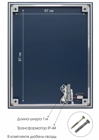 В комплекте: дюбель-крючки 2шт., встроенный LED-светильник, сенсорный выключатель, диммер для регулировки яркости, шнур с вилкой. |