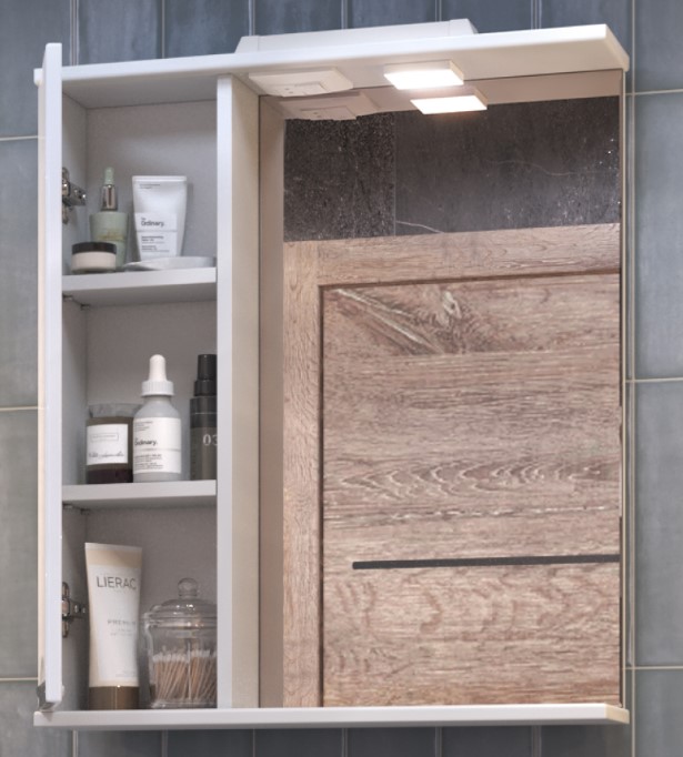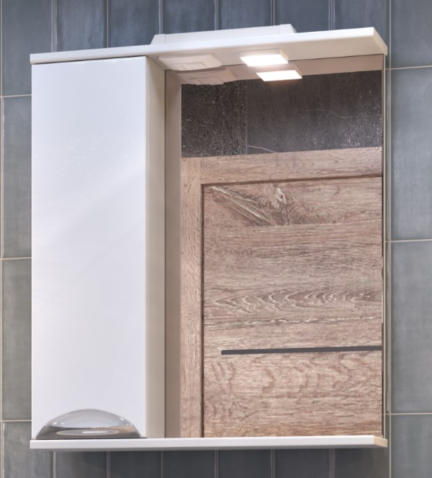 Зеркало-шкаф Vigo Callao 600 60x70 с Led-подсветкой, левый 19 600-Л, из влагостойких материалов.Свойства. Зеркало-шкаф Callao 600 60x70 см 19 600-Л с одной распашной дверцей с плавным закрыванием. Внутри две полки из ЛДСП. Корпус изготовлен из влагостойкой ЛДСП. Фасад-ЛМДФ с глянцевой пленкой ПВХ. Светильник один. Ручка врезная металлическая. Зеркальное полотно влагостойкое. Производство. Vigo-это российская компания, занимающаяся выпуском мебели для ванных комнат с 2010 года. На производстве используются новейшие технологии и высокоточное программное оборудование. Качество. Мебель Vigo изготавливается из влагостойких материалов. Фурнитура европейских производителей. Каждый товар соответствует стандартам качества. Дизайн. Мебель Vigo стильная, функциональная и надежная. Большое внимание уделяется изучению мировых дизайнерских тенденций в оформлении ванных комнат, а также изучению потребностей потребителей. Изображение на мониторе может отличаться от оригинала. Комплектность: