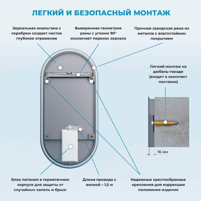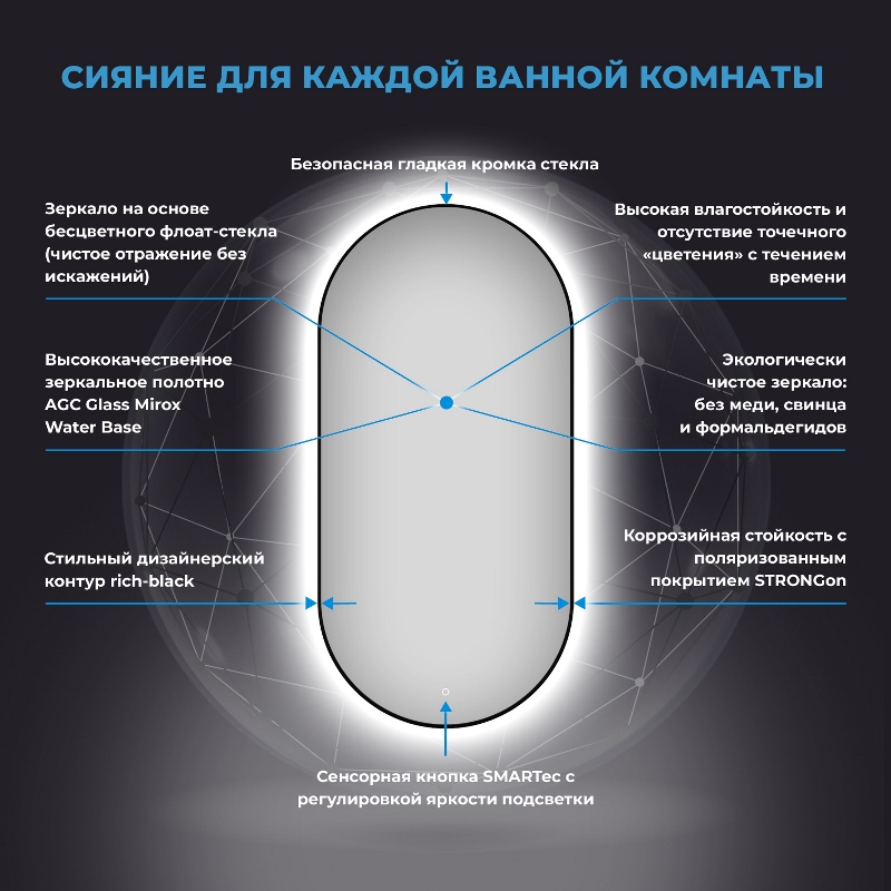 Сенсорное зеркало Wellsee 7 Rays' Spectrum 50x100 с фоновым Led-освещением 172201890 из серебряной амальгамы AGC Glass Mirox Water Base 4 мм.Свойства. В основе изделия бесцветное флоат-стекло – чистое отражение без искажений. Экологически чистый состав без меди, свинца и формальдегидов. Безопасная гладкая кромка с антикоррозийным поляризованным покрытием STRONGon. В безрамочных краях не накапливаются пыль и грязь. Изящный контур rich-black (насыщенный черный). Легкий монтаж на дюбель-гвозди. Бесконтактное зеркало Wellsee 7 Rays' Spectrum 50x100 см со встроенным светильником 172201890 не покрывается плесенью со временем при должном своевременном уходе. Сенсорная кнопка SMARTec для включения\выключения и регулировки яркости. Зеркало запоминает последнее положение уровня яркости. Срок службы диодной ленты до 7 лет непрерывной работы. Равномерное яркое свечение с плотностью светодиодов 120 шт\м. Температура освещения около 4000 К, что почти соответствует дневному свету. Диоды ленты скрыты и не видны сбоку. Блок питания в герметичном защитном корпусе. Класс пылевлагозащиты IP 44. Производство. Польская компания Wellsee выпускает сантехнику для ванных и душевых комнат. Современное ультратехнологичное оборудование. Заводы расположены в Польше, Турции, Китае и Беларуси. Качество. Продукция соответствует строгим международным стандартам. Качество Европа. Гарантия. Продолжительная гарантия от производителя - 3 года. Изображение и цвет на мониторе могут отличаться от оригинала. Комплектность: