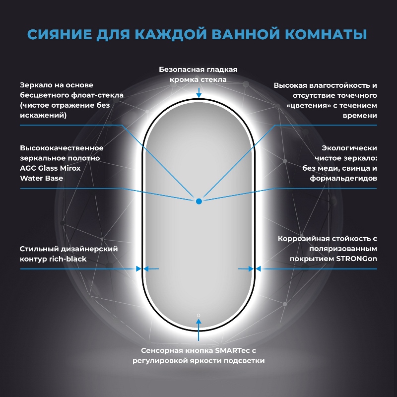 Сенсорное зеркало Wellsee 7 Rays' Spectrum 55x110 с фронтальным Led-освещением 172202030 из серебряной амальгамы AGC Glass Mirox Water Base 4 мм.Свойства. В основе изделия бесцветное флоат-стекло – чистое отражение без искажений. Экологически чистый состав без меди, свинца и формальдегидов. Безопасная гладкая кромка с антикоррозийным поляризованным покрытием STRONGon. В безрамочных краях не накапливаются пыль и грязь. Изящный контур rich-black (насыщенный черный). Легкий монтаж на дюбель-гвозди. Бесконтактное зеркало Wellsee 7 Rays' Spectrum 55x110 см со встроенным светильником 172202030 не покрывается плесенью со временем при должном своевременном уходе. Сенсорная кнопка SMARTec для включения\выключения и регулировки яркости. Зеркало запоминает последнее положение уровня яркости. Срок службы диодной ленты до 7 лет непрерывной работы. Равномерное яркое свечение с плотностью светодиодов 120 шт\м. Температура освещения около 4000 К, что почти соответствует дневному свету. Диоды ленты скрыты и не видны сбоку. Блок питания в герметичном защитном корпусе. Класс пылевлагозащиты IP 44. Производство. Польская компания Wellsee выпускает сантехнику для ванных и душевых комнат. Современное ультратехнологичное оборудование. Заводы расположены в Польше, Турции, Китае и Беларуси. Качество. Продукция соответствует строгим международным стандартам. Качество Европа. Гарантия. Продолжительная гарантия от производителя - 3 года. Изображение и цвет на мониторе могут отличаться от оригинала. Комплектность: