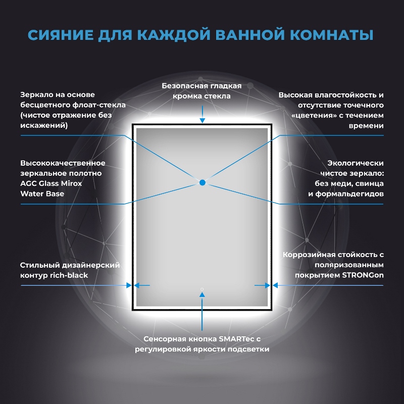 Сенсорное зеркало Wellsee 7 Rays' Spectrum 70x85 с фронтальным Led-освещением 172201300 из серебряной амальгамы AGC Glass Mirox Water Base 4 мм. Свойства. В основе изделия бесцветное флоат-стекло – чистое отражение без искажений. Экологически чистый состав без меди, свинца и формальдегидов. Безопасная гладкая кромка с антикоррозийным поляризованным покрытием STRONGon. В безрамочных краях не накапливаются пыль и грязь. Изящный контур rich-black (насыщенный черный). Легкий монтаж на дюбель-гвозди. Бесконтактное зеркало Wellsee 7 Rays' Spectrum 70x85 см со встроенным светильником 172201300 не покрывается плесенью со временем при должном своевременном уходе. Сенсорная кнопка SMARTec для включения\выключения и регулировки яркости. Зеркало запоминает последнее положение уровня яркости. Срок службы диодной ленты до 7 лет непрерывной работы. Равномерное яркое свечение с плотностью светодиодов 120 шт\м. Температура освещения около 4000 К, что почти соответствует дневному свету. Диоды ленты скрыты и не видны сбоку. Блок питания в герметичном защитном корпусе. Класс пылевлагозащиты IP 44. Производство. Польская компания Wellsee выпускает сантехнику для ванных и душевых комнат. Современное ультратехнологичное оборудование. Заводы расположены в Польше, Турции, Китае и Беларуси. Качество. Продукция соответствует строгим международным стандартам. Качество Европа. Гарантия. Продолжительная гарантия от производителя - 3 года. Изображение и цвет на мониторе могут отличаться от оригинала. Комплектность: