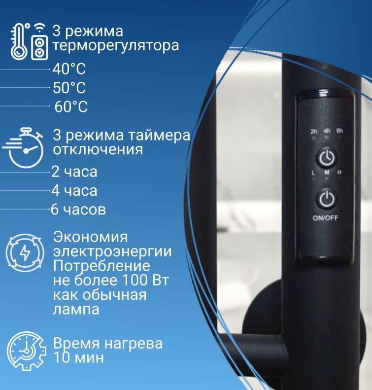 Полотенцесушитель Маргроид Ferrum Inaro 120×6×12 электрический из конструкционной стали.Свойства. Модель Ferrum Inaro имеет три режима температуры 40℃, 50℃, 60℃ и таймером на 2, 4 и 6 часов. Полотенцесушитель фиксируется на четырёх опорах. Внутри него проходит нагревательный кабель. Скрытое подключение и блок управления справа. Выводы проводов универсальные, их можно расположить как слева, так и справа. Мощность 100 Вт. Производство. Крупнейшая компания Маргроид более 25 лет занимается выпуском полотенцесушителей из нержавеющей стали. Собственное производство труб, из которых изготавливают змеевики. Современное оборудование (Европа). Инновационные технические решения. Качество. Контроль продукции на всех этапах, начиная с изготовления трубы и заканчивая упаковкой готового изделия. Все полотенцесушители имеют сертификаты соответствия. Изображение и цвет на мониторе могут отличаться от оригинала. Комплектность: