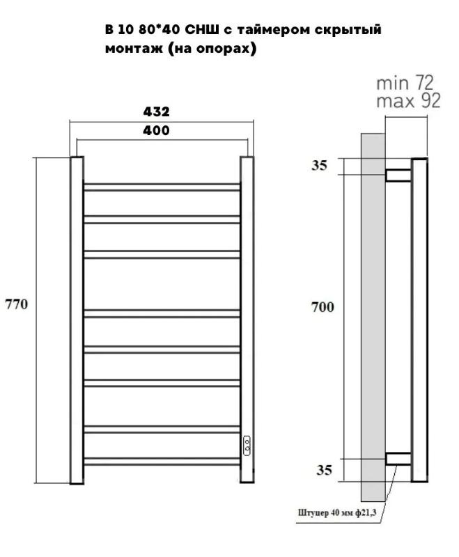 Электрический полотенцесушитель Маргроид Вид 10 СНШ 80x40, белый матовый из конструкционной стали.Свойства. Модель Вид 10 СНШ с тремя режимами температуры 40℃, 50℃, 60℃. Таймер на 2, 4 и 6 часов. Полотенцесушитель фиксируется на четырёх опорах. Внутри него проходит нагревательный кабель. Скрытое подключение и блок управления справа. Выводы проводов универсальные, их можно расположить как слева, так и справа. Мощность 100 Вт. Производство. Крупнейшая компания Маргроид более 25 лет занимается выпуском полотенцесушителей из нержавеющей стали. Собственное производство труб, из которых изготавливают змеевики. Современное оборудование (Европа). Инновационные технические решения. Качество. Контроль продукции на всех этапах, начиная с изготовления трубы и заканчивая упаковкой готового изделия. Все полотенцесушители имеют сертификаты соответствия. Изображение и цвет на мониторе могут отличаться от оригинала. Комплектность: