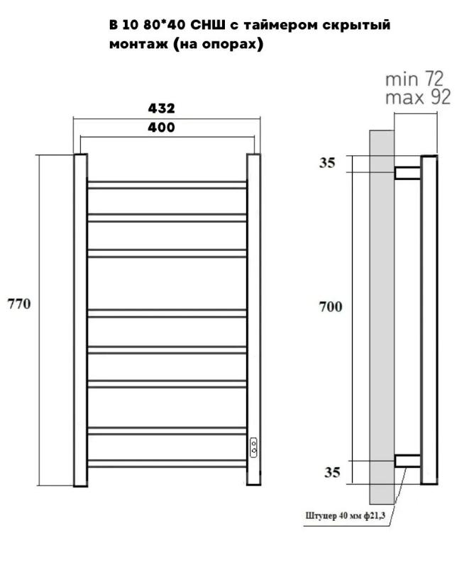 Электрический полотенцесушитель Маргроид Вид 10 СНШ 80x40, черный матовый из конструкционной стали.Свойства. Модель Вид 10 СНШ с тремя режимами температуры 40℃, 50℃, 60℃. Таймер на 2, 4 и 6 часов. Полотенцесушитель фиксируется на четырёх опорах. Внутри него проходит нагревательный кабель. Скрытое подключение и блок управления справа. Выводы проводов универсальные, их можно расположить как слева, так и справа. Мощность 100 Вт. Производство. Крупнейшая компания Маргроид более 25 лет занимается выпуском полотенцесушителей из нержавеющей стали. Собственное производство труб, из которых изготавливают змеевики. Современное оборудование (Европа). Инновационные технические решения. Качество. Контроль продукции на всех этапах, начиная с изготовления трубы и заканчивая упаковкой готового изделия. Все полотенцесушители имеют сертификаты соответствия. Изображение и цвет на мониторе могут отличаться от оригинала. Комплектность: