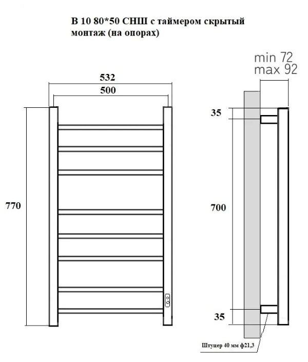 Электрический полотенцесушитель Маргроид Вид 10 СНШ 80x50, белый матовый из конструкционной стали.Свойства. Модель Вид 10 СНШ с тремя режимами температуры 40℃, 50℃, 60℃. Таймер на 2, 4 и 6 часов. Полотенцесушитель фиксируется на четырёх опорах. Внутри него проходит нагревательный кабель. Скрытое подключение и блок управления справа. Выводы проводов универсальные, их можно расположить как слева, так и справа. Мощность 100 Вт. Производство. Крупнейшая компания Маргроид более 25 лет занимается выпуском полотенцесушителей из нержавеющей стали. Собственное производство труб, из которых изготавливают змеевики. Современное оборудование (Европа). Инновационные технические решения. Качество. Контроль продукции на всех этапах, начиная с изготовления трубы и заканчивая упаковкой готового изделия. Все полотенцесушители имеют сертификаты соответствия. Изображение и цвет на мониторе могут отличаться от оригинала. Комплектность: