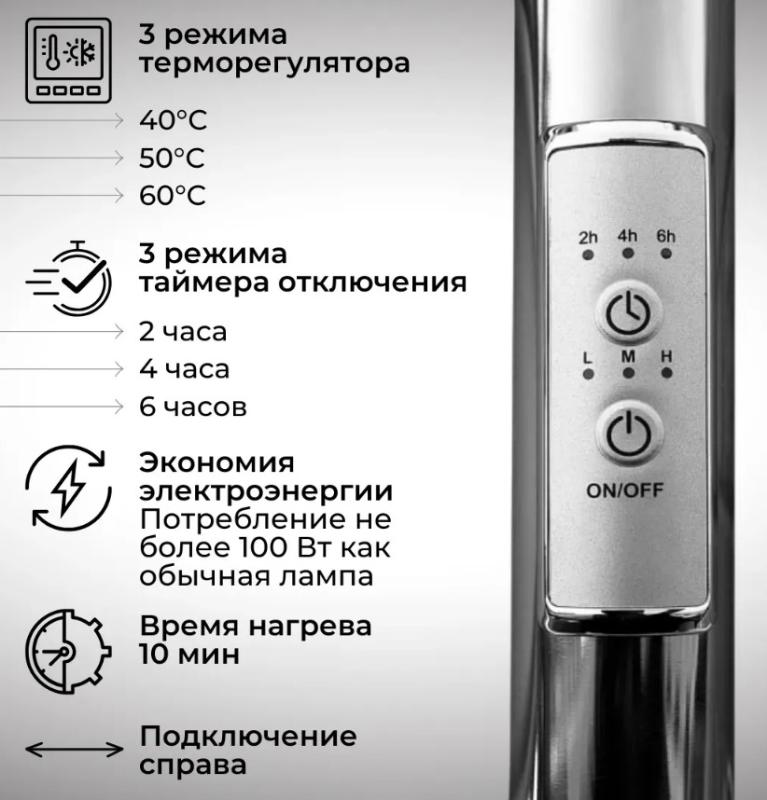 Электрический полотенцесушитель Маргроид Вид 10 СНШ 80x50, хром глянец из конструкционной стали.Свойства. Модель Вид 10 СНШ с тремя режимами температуры 40℃, 50℃, 60℃. Таймер на 2, 4 и 6 часов. Полотенцесушитель фиксируется на четырёх опорах. Внутри него проходит нагревательный кабель. Скрытое подключение и блок управления справа. Выводы проводов универсальные, их можно расположить как слева, так и справа. Мощность 100 Вт. Производство. Крупнейшая компания Маргроид более 25 лет занимается выпуском полотенцесушителей из нержавеющей стали. Собственное производство труб, из которых изготавливают змеевики. Современное оборудование (Европа). Инновационные технические решения. Качество. Контроль продукции на всех этапах, начиная с изготовления трубы и заканчивая упаковкой готового изделия. Все полотенцесушители имеют сертификаты соответствия. Изображение и цвет на мониторе могут отличаться от оригинала. Комплектность: