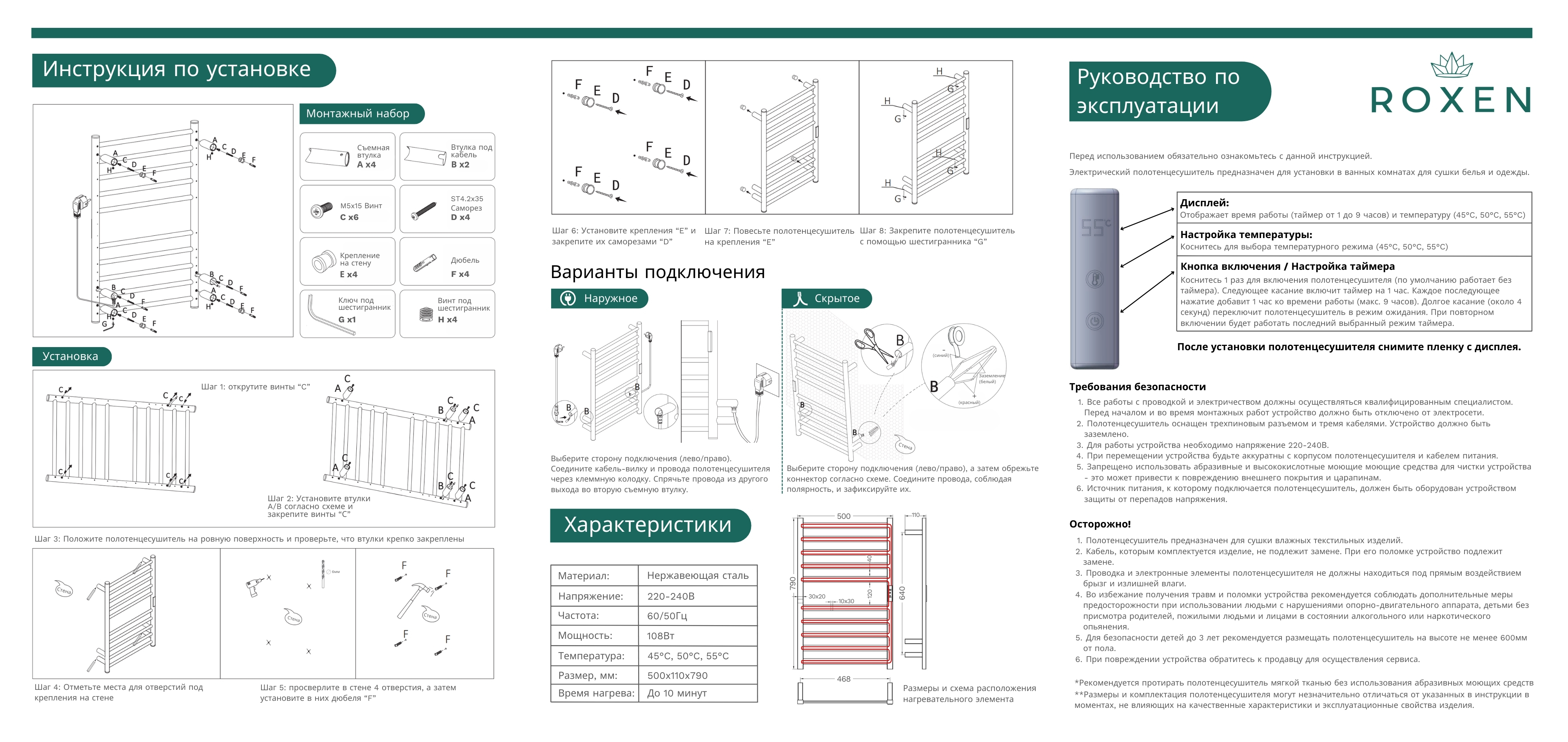 Электрический полотенцесушитель Roxen Caspia 50x79 11070-5079C из высококачественной нержавеющей стали.Свойства материала. Сталь марки AISI 304L, 8% никеля и 18% хрома в составе. Прочная нержавейка, устойчивая к образованию коррозии и растворам кислот. Лазерная обработка швов. Толщина стенки трубы 2 мм. Нагревательный кабель сухого типа. Сенсорная панель управления справа, таймер 1-9 часов. Мощность 108 W, степень защиты IP 44. Регулировка температуры 45, 50, 55. Подключение через кабель-вилку или скрытый монтаж электрических элементов. Производство. Компания Roxen основана в Финляндии. Благодаря современному оборудованию, инновационным технологиям и строгому скандинавскому подходу ее продукция заслуженно держится в топе продаж. Качество. Сантехника Roxen изготовлена только из проверенных, безопасных материалов. Каждое изделие проходит обязательную проверку на соответствие международным стандартам. Высокая надежность, безупречные линии и доступность делают изделия Роксен привлекательным выбором на любой вкус. Гарантия. Увеличенный срок гарантии - 10 лет Изображение на мониторе может отличаться от оригинала. Комплектность: