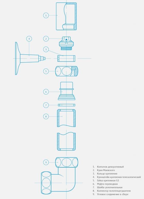 В комплекте: колпачок с краном Маевского-2 шт., держатель без кольца-2 шт.Дополнительно комплектуется: уголок г 1"х*-2 шт., декоративный отражатель*-2 шт. |