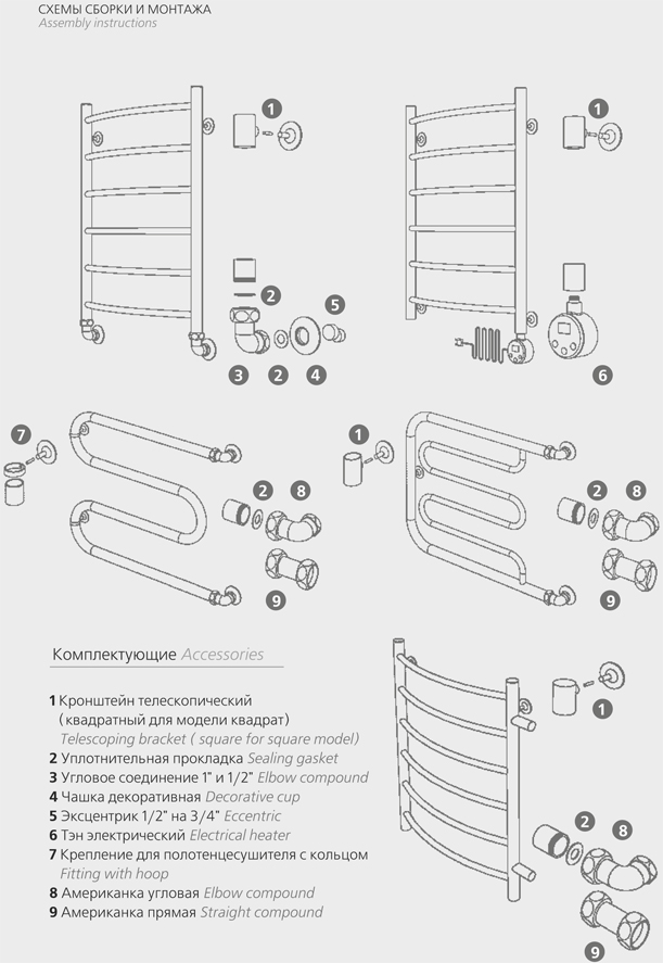 Дополнительно комплектуется: американка прямая 1"x1/2" г/г, американка прямая 1"x3/4" г/г, американка прямая 1"x1" г/г, американка прямая 1"x1/2" г/ш, американка прямая 1"x3/4" г/ш, американка прямая 1"x1" г/ш, американка угловая 1"x1/2" г/г, американка угловая 1"x3/4" г/г, американка угловая 1"x1" г/г, американка угловая 1"x1/2" г/ш, американка угловая 1"x3/4" г/ш, американка угловая 1"x1" г/ш, американка проходная прямая 1", американка проходная угловая 1"х1", стакан, вентиль угловой 1"х3/4" г/г, ТЭН, чашка декоративная, стяжная муфта 1"х1", крепления с кольцом.