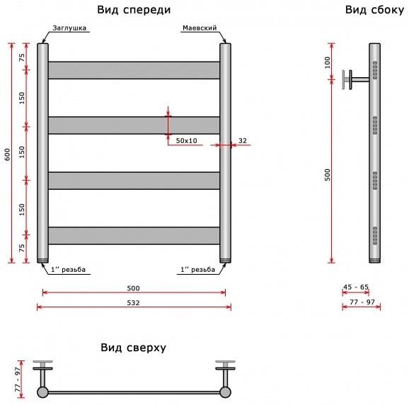 Полотенцесушитель Ростела Престиж 50x60 водяной, нижнее, черный матовый. Все характеристики |