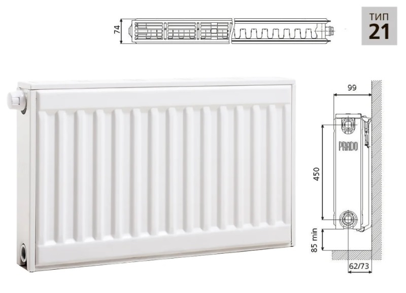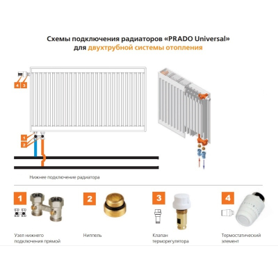 Радиатор Prado Universal Type 21 300x50 сталь, нижн. из стали.Свойства. Панельные радиаторы с конвекционными элементами для систем отопления жилых, общественных и промышленных зданий. Сталь очень быстро нагревается и мгновенно нагревает пространство вокруг себя. Цвет-белый RAL 9016. Боковые поверхности закрыты защитными элементами, верхняя поверхность закрыта воздуховыпускной панелью. Подключение прибора к системе отопления осуществляется по универсальной схеме: через два нижних присоединительных отверстия, расположенных с одной стороны радиатора, или через четыре боковых присоединительных отверстия, которые расположены в углах радиатора. Термостатический клапан для автоматической регулировки температуры фирмы Danfoss (Дания). Средняя теплоотдача при температуре входящей горячей воды 50 градусов-3466 Вт, 70 градусов-5333 Вт. Радиатор Universal Type 21 300x50 см с двумя рядами панелей по глубине, с одним рядом оребрения, приваренного к тыльной стороне передней панели, с воздуховыпускной решёткой и боковыми стенками. Производство. ООО «Прадо» (г.Ижевск) с 2005 года выпускает панельные стальные радиаторы. В производстве используется современное автоматизированное оборудование. Панельные радиаторы "Прадо" поставляются во многие регионы России, в Беларусь и другие страны СНГ. Качество. Радиаторы Prado полностью соответствуют ГОСТ 31311 «Приборы отопительные. Общие технические условия». В производстве используются и постоянно внедряются самые современные технологии и материалы, средства автоматизации и контроля. Гарантия. Продолжительная гарантия - 10 лет. Изображение и цвет на мониторе могут отличаться от оригинала. Комплектность: