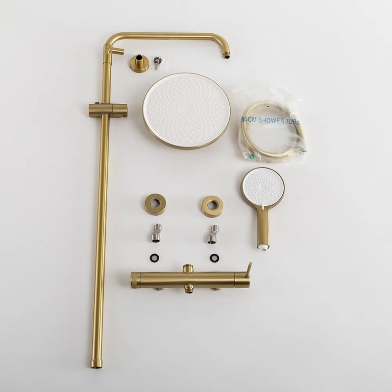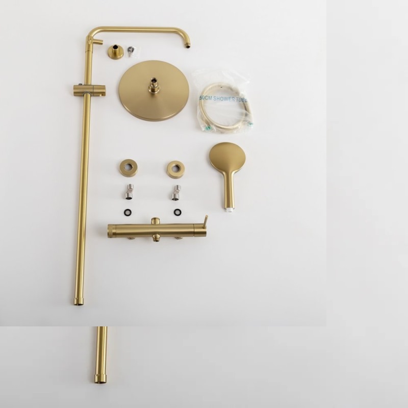 В комплекте: ручной душ, верхний душ, смеситель, душевой шланг, металлическая штанга, держатель душевой лейки, дивертор. |
