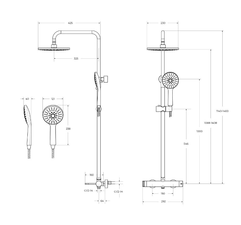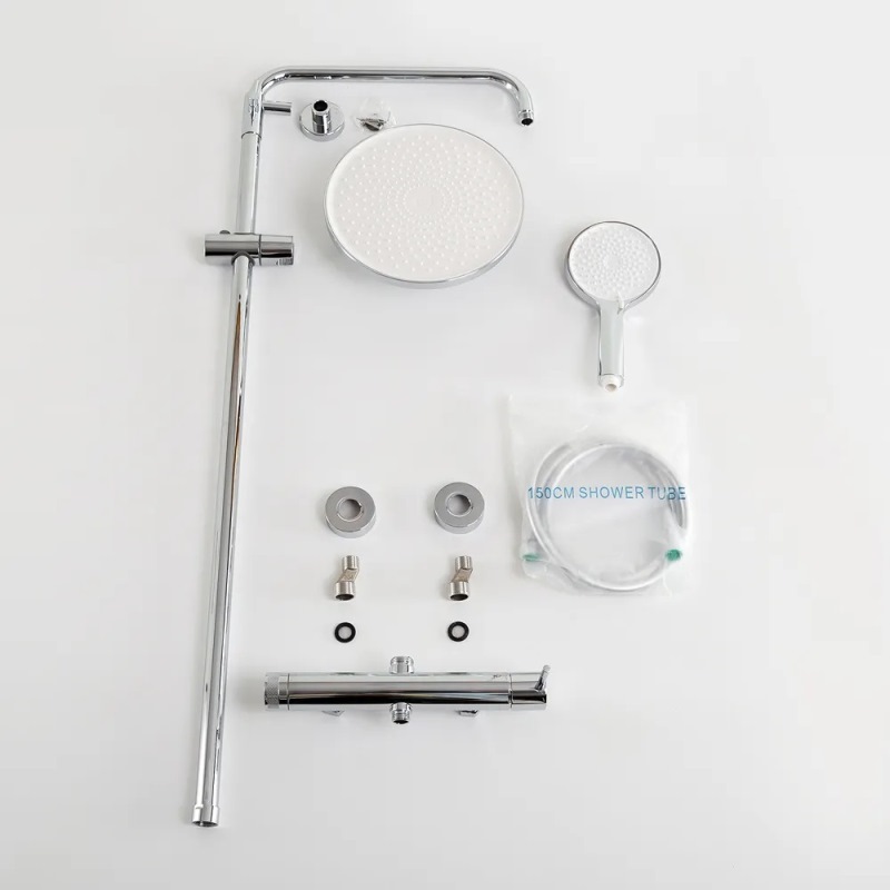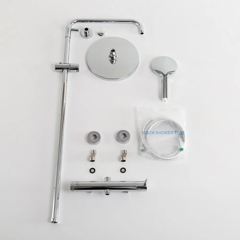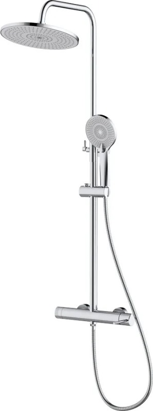 В комплекте: ручной душ, верхний душ, смеситель, душевой шланг, металлическая штанга, держатель душевой лейки, дивертор. |