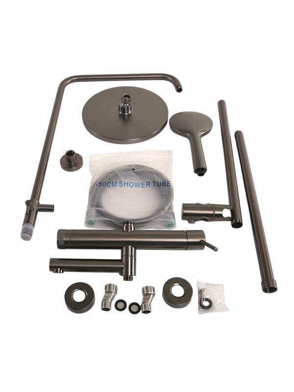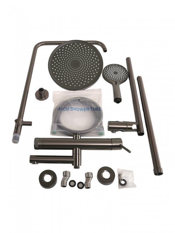 В комплекте: ручной душ, верхний душ, смеситель с поворотным изливом, аэратор, душевой шланг, металлическая штанга, держатель душевой лейки, дивертор. |