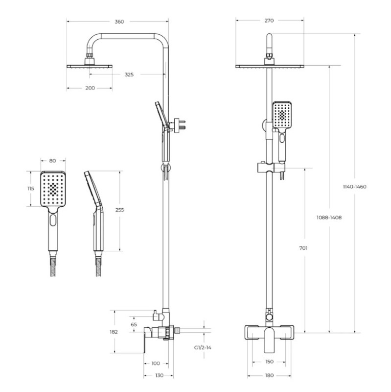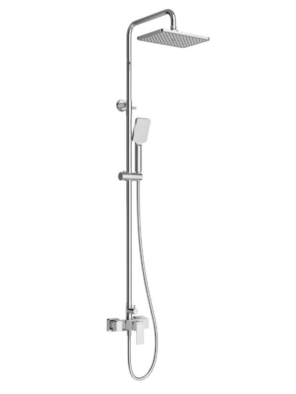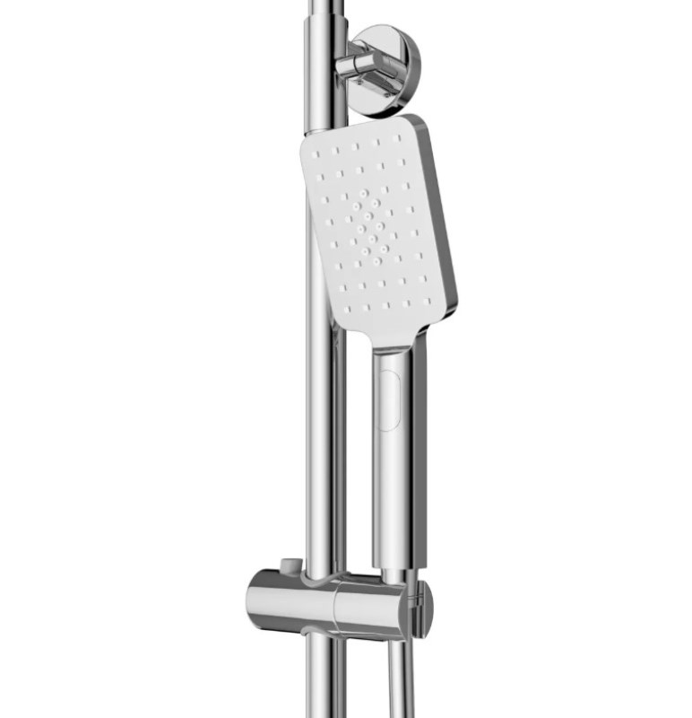 В комплекте: ручной душ, верхний душ, смеситель, душевой шланг, металлическая штанга, держатель душевой лейки, дивертор. |