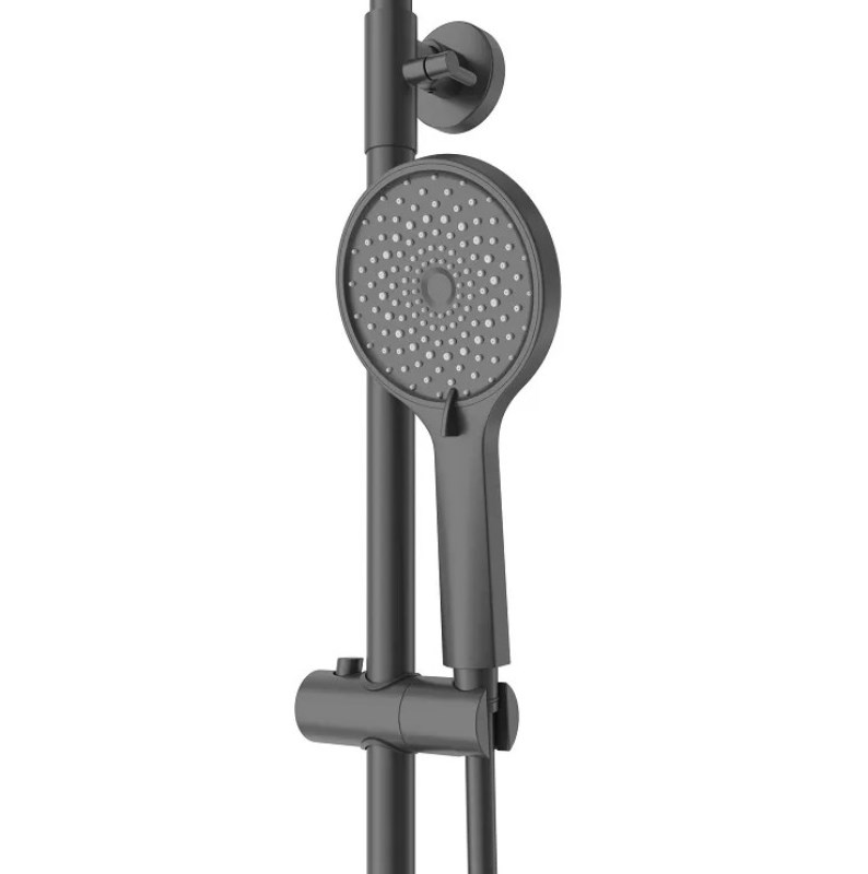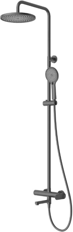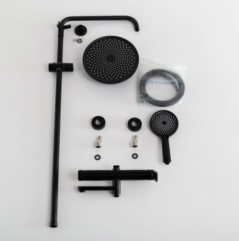В комплекте: ручной душ, верхний душ, смеситель с поворотным изливом, душевой шланг, металлическая штанга, держатель душевой лейки, дивертор. |