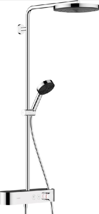В комплекте: термостатический смеситель-полка для душа ShowerTablet Select 400 с предохранительным ограничителем при 40°C латунь, душевая стойка с шарнирным соединением для регулировки угла наклона верхнего душа, тропическая лейка 26 см (режим PowderRain), ручная лейка (режимы: PowderRain, IntenseRain, массажный), душевой шланг, держатель для ручной лейки регулируемый по высоте и углу наклона с внешней кнопкой Select, крепления. |