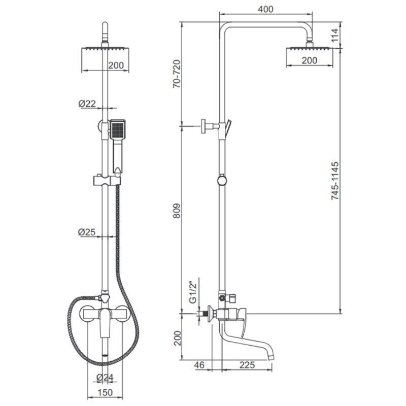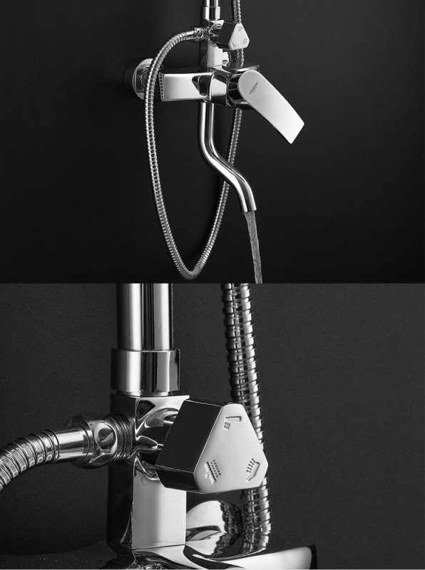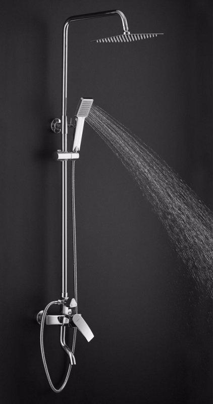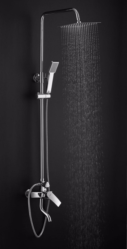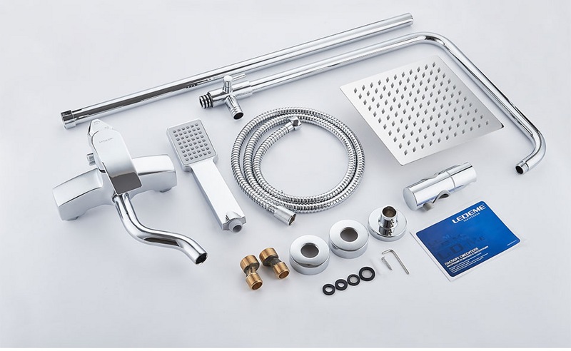 В комплекте: смеситель, душевая штанга, верхний душ, кронштейн для верхнего душа, ручной душ, душевой шланг, держатель для ручного душа. |
