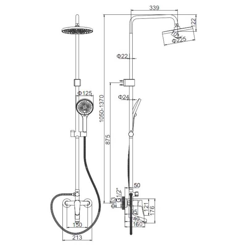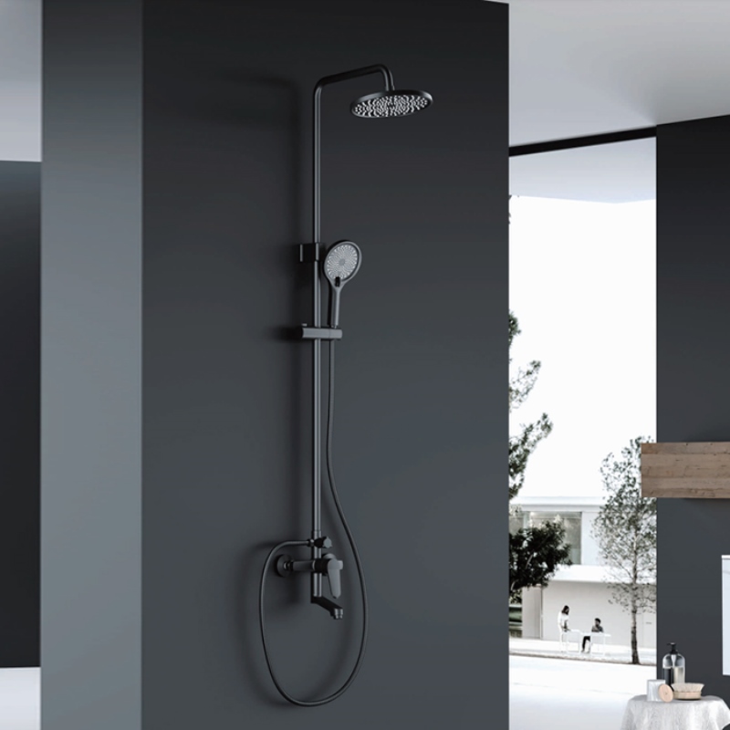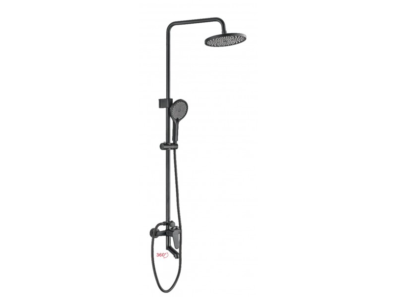 В комплекте: смеситель, душевая штанга, верхний душ, кронштейн для верхнего душа, ручной душ, душевой шланг, держатель для ручного душа. |