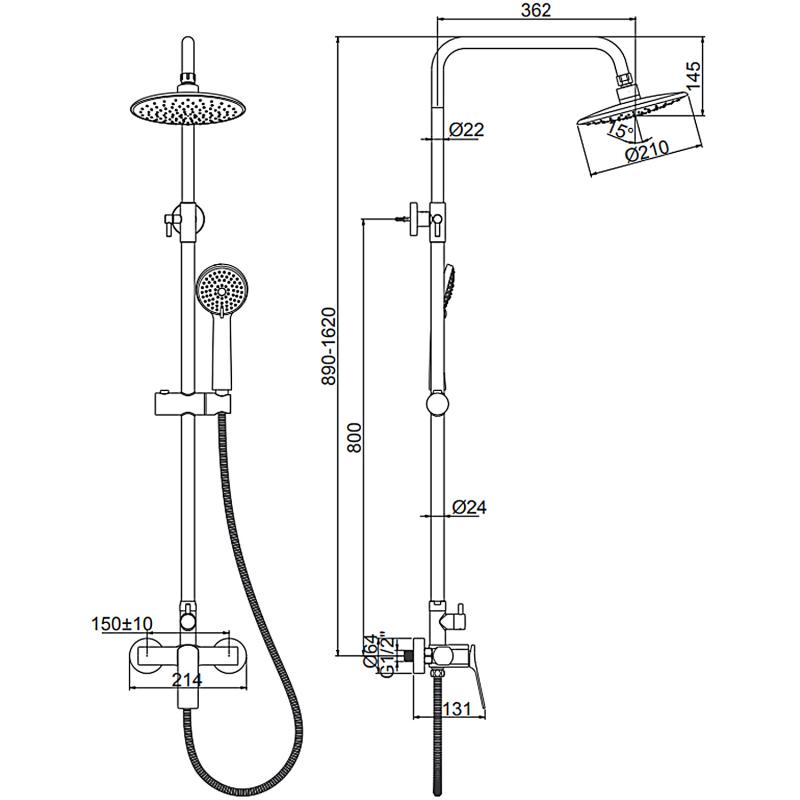 В комплекте: смеситель, душевая штанга, верхний душ, кронштейн для верхнего душа, ручной душ, душевой шланг, держатель для ручного душа. |