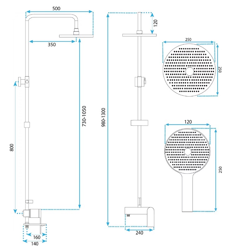В комплекте: смеситель для душа, душевая штанга, тропический душ, ручной душ, душевой шланг 150 см, держатель для ручного душа. |