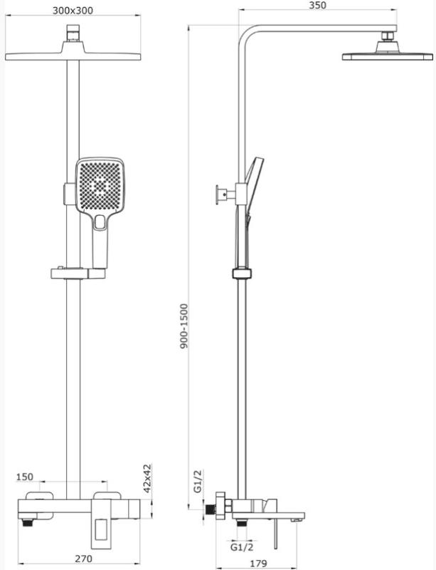 В комплекте: душевая штанга, смеситель для ванны с изливом, тропический душ, ручной душ, душевой шланг, держатель для ручного душа. |