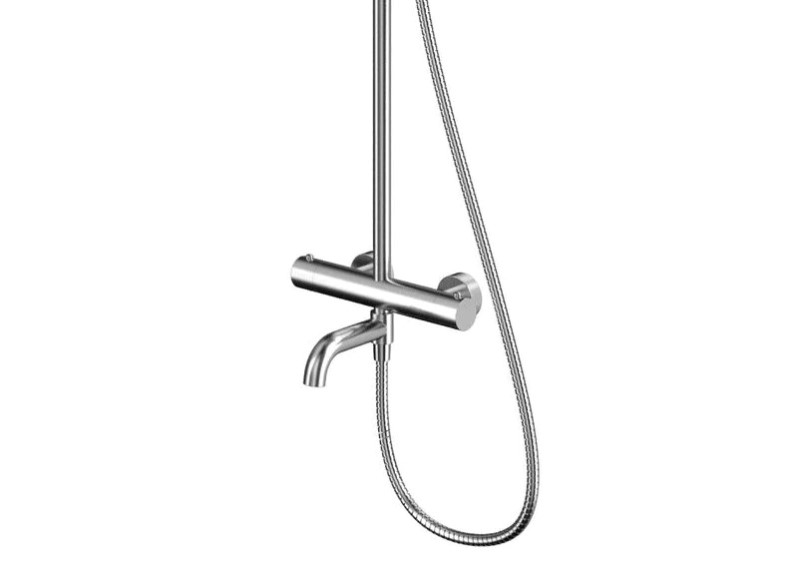 В комплекте: смеситель-термостат, душевая штанга, верхний душ, кронштейн для верхнего душа, ручной душ, душевой шланг, держатель для ручного душа. |