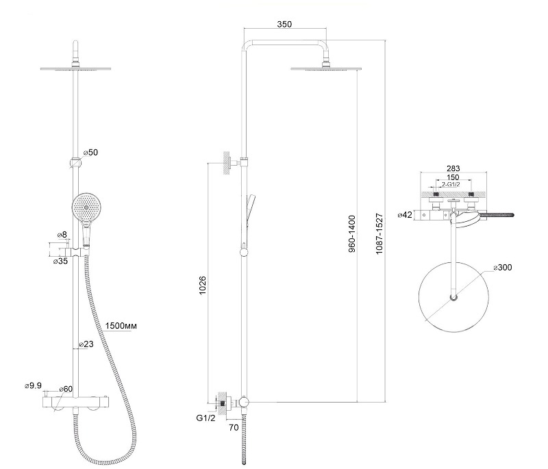 В комплекте: смеситель-термостат, душевая штанга, верхний душ, кронштейн для верхнего душа, ручной душ, душевой шланг, держатель для ручного душа. |