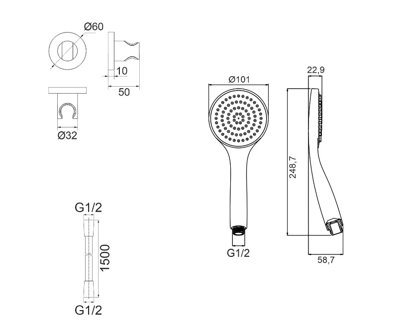 В комплекте: душевая лейка, держатель для лейки, душевой шланг. |