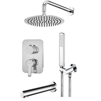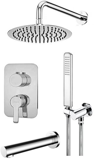 В комплекте: смеситель для ванны с изливом, встраиваемая часть 3 функции, ручной душ 1 режим, верхний душ 25 см сталь, кронштейн для верхнего душа 36 см, душевой шланг 150 см сталь, держатель для ручного душа с соединением угловым. |