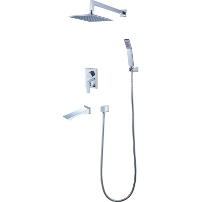 В комплекте: смеситель для душа, встроенная часть, тропический душ, кронштейн для тропического душа, ручной душ, душевой шланг, подключение для душевого шланга, держатель для ручного душа, каскадный излив. |
