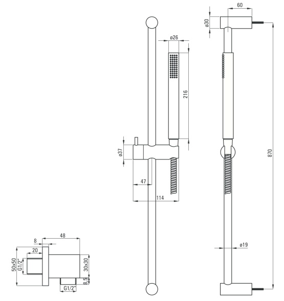 В комплекте: ручной душ, встроенный смеситель, душевой шланг, штанга. |