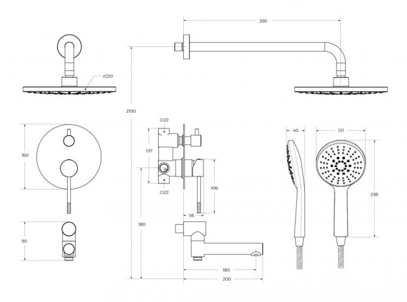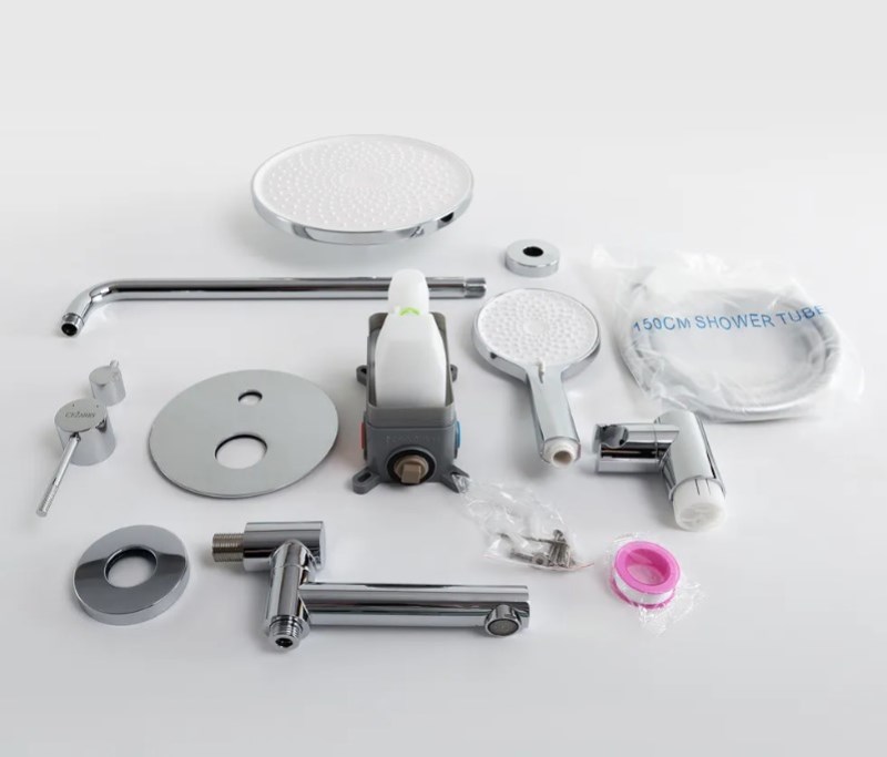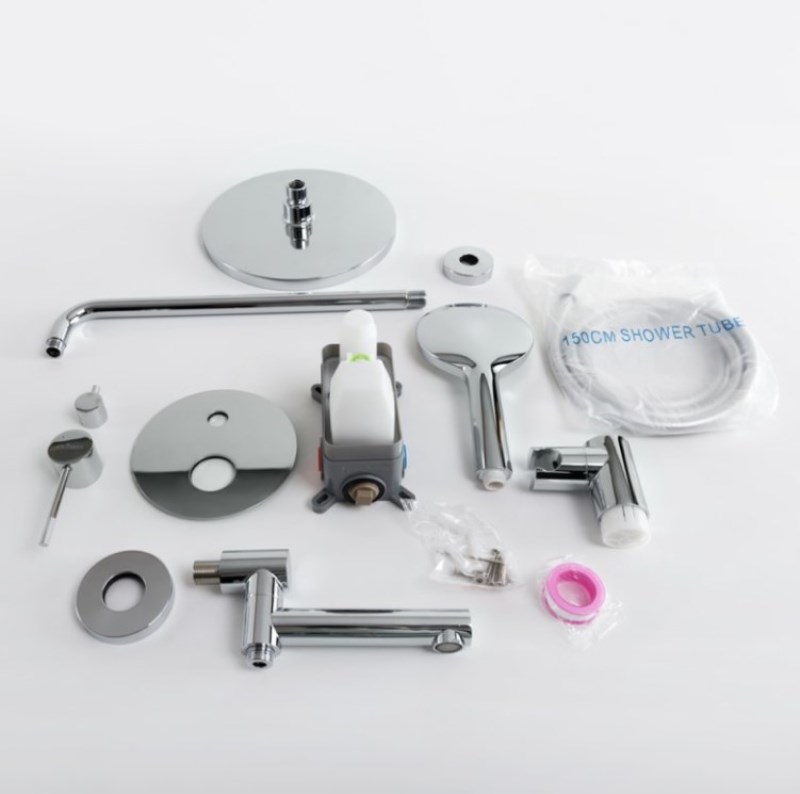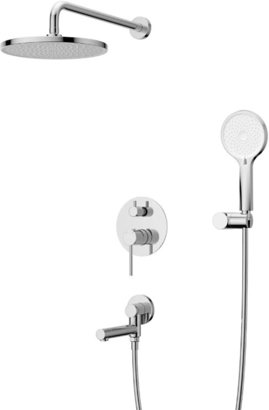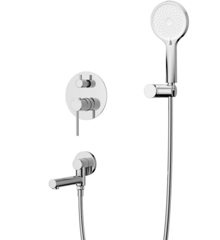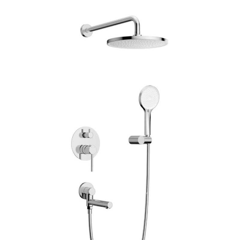 В комплекте: встраиваемый смеситель с переключателем на два выхода, поворотный излив для ванны, тропический душ, кронштейн для тропического душа, ручной душ, душевой шланг, держатель для ручного душа, скрытая монтажная часть. |