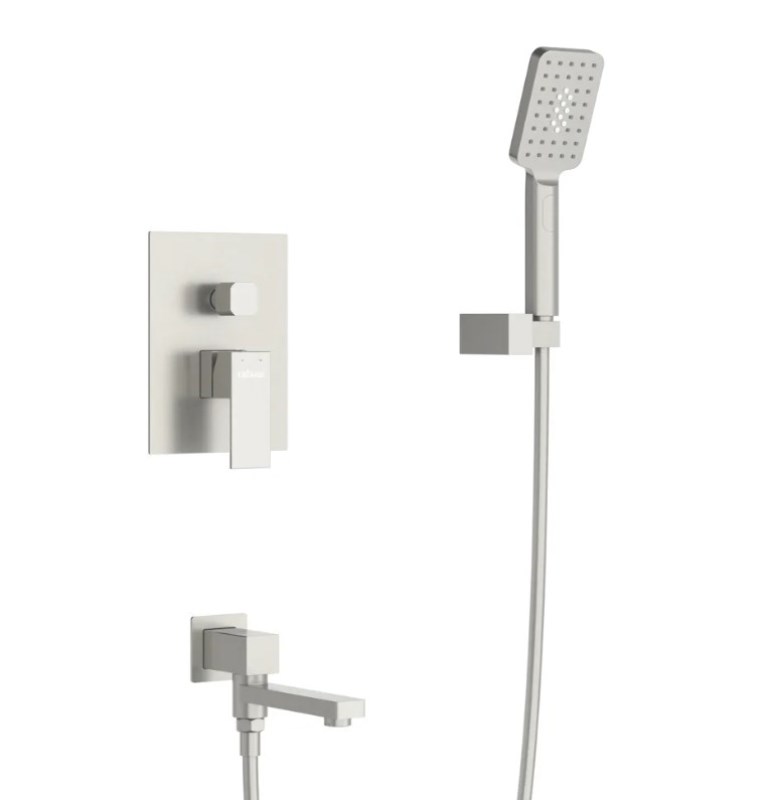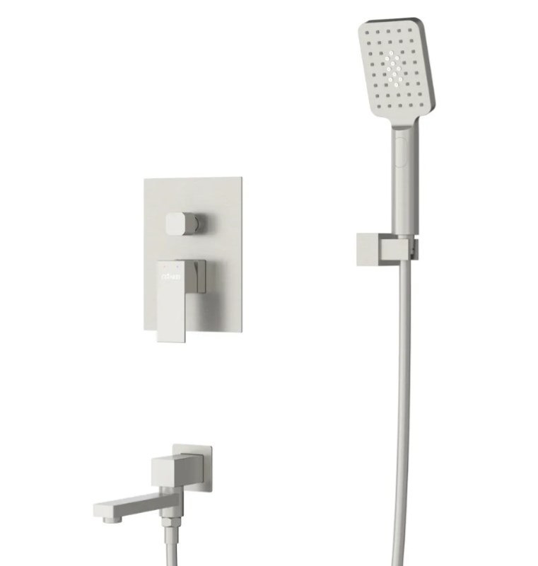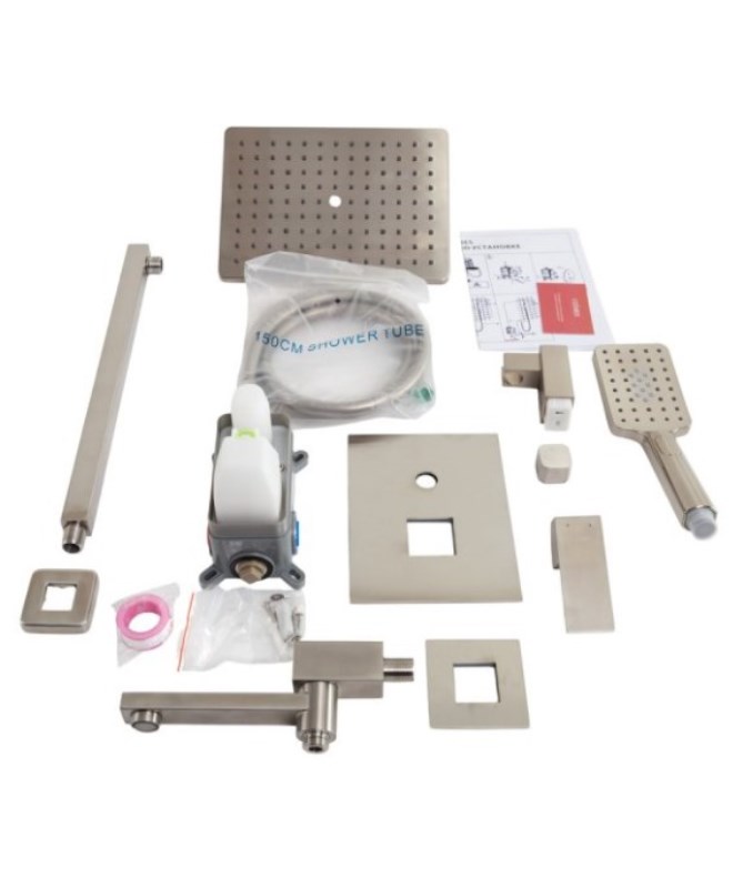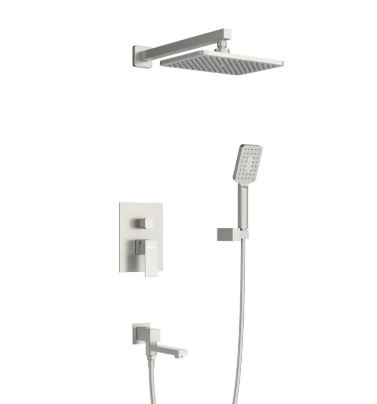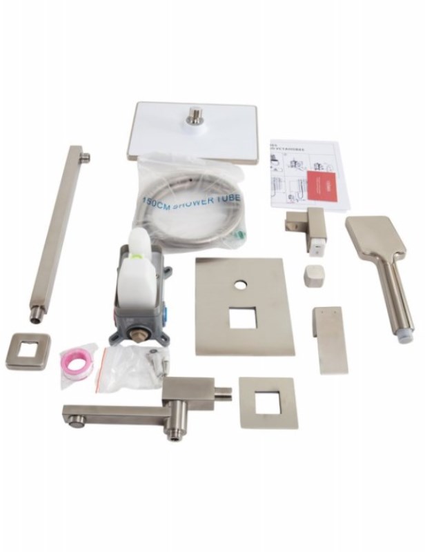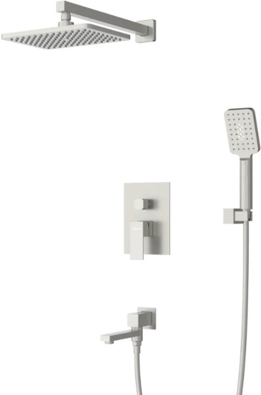 В комплекте: встраиваемый смеситель с переключателем на три выхода, поворотный излив для ванны, тропический душ, кронштейн для тропического душа, ручной душ, душевой шланг, держатель для ручного душа, скрытая монтажная часть. |