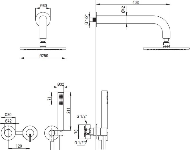 В комплекте: смеситель латунь, скрытая часть смесителя, верхний тропический душ латунь, кронштейн для верхнего душа, ручная лейка Anti-calc и Cool-out 1 режим дождик, душевой шланг 150 см ПВХ Anti-Twist наконечники латунь, держатель ручной лейки с подключением. |