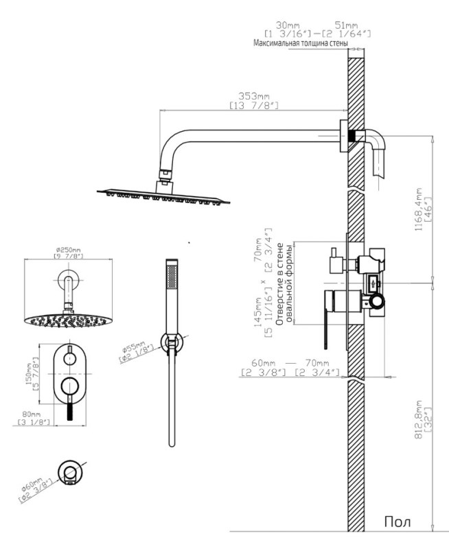 Встроенная душевая система Gid Edessa L070-GM-VD3, вороненая сталь. Все характеристики |