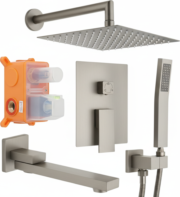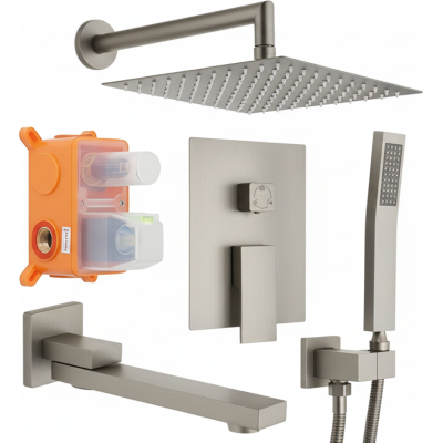 В комплекте: смеситель, встраиваемая часть, излив, верхний душ, кронштейн для верхнего душа, лейка, держатель для лейки, душевой шланг. |